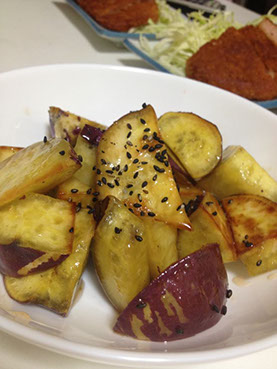 1: 昭和初期、資金繰りに困った東大生が 「揚げたイモに砂糖をからめる」という中国の宮廷料理をヒントに、揚げたイモに水あめをからめて売り出したところ、学生の間で大ブレイク!「大学イモ」として定番になった。