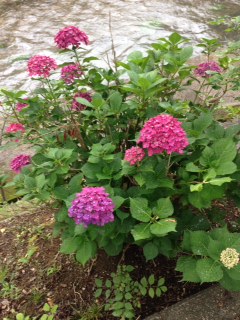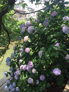 いたち川沿いは満開のあじさいに彩られて、美しい風景が広がっています。歩いていると、梅雨のうっとうしさをひととき忘れることができます。