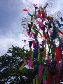 いたち川べりにひと足早く七夕飾りが登場しました。地区の方が毎年立てて下さり、願い事が書かれた鈴なりの短冊が風になびいています。