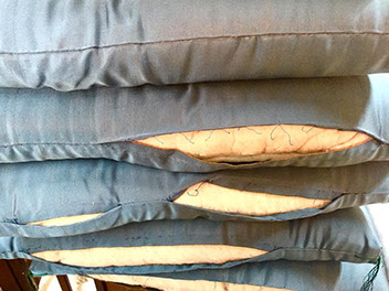 拝見すると、なるほど、ところどころ糸が弱って切れて、中綿が顔を出しています。幾度となくお客さまをもてなし、大活躍したことでしょう。さっそく補修をして、新しい座布団カバーをかけ、納品させていただくこととなりました。