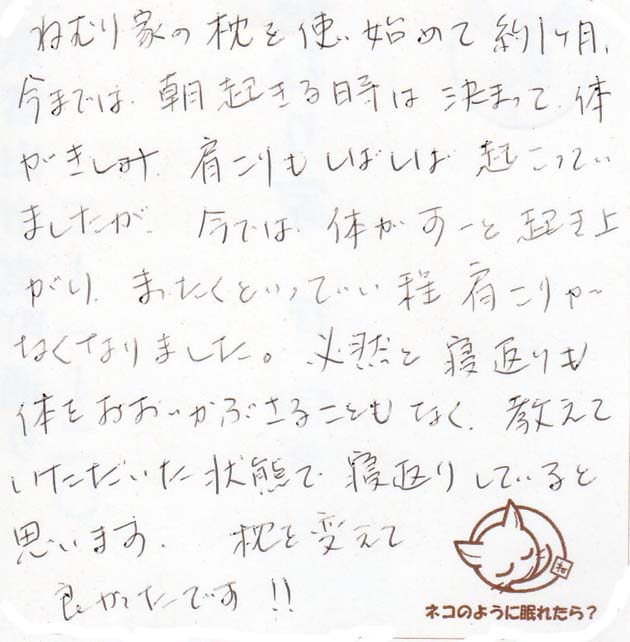 ねむり家の枕を使い始めて約1か月。今までは朝起きるときは決まって体がきしみ、肩こりもしばしば起こっていましたが、今までは体がすーっと起き上がり、まったくといっていい程、肩こりがなくなりました。必然と寝返りも体を覆いかぶさることもなく、教えていただいた状態で寝返りしていると思います。枕を変えて良かったです!