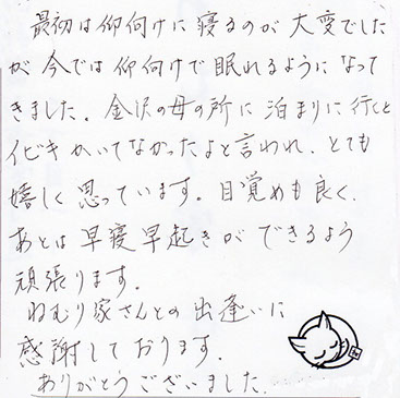 最初は仰向けに寝るのが大変でしたが、今では仰向けで眠れるようになっていきました。金沢の母の所に泊まりに行くとイビキかいてなかったよと言われ、とても嬉しく思っています。目覚めもよく、あとは早寝早起きができるよう頑張ります。ねむり家さんとの出逢いに感謝しております。ありがとうございました。