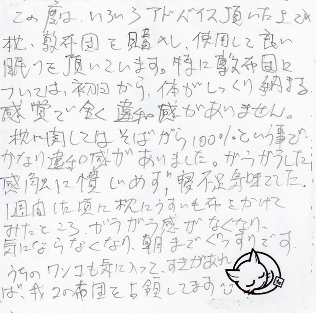 この度は、いろいろアドバイス頂いた上で枕、敷布団を購入し、使用して良い眠りを頂いています。特に敷布団については、初日から体がしっくり収まる感覚で、全く違和感がありません。枕に関しては、そば殻100%ということで、かなり違和感がありました。ガラガラした感触に馴染めず、寝不足気味でした。1週間したころに、枕に薄い毛布を掛けてみたところ、ガラガラ感がなくなり、気にならなくなり、朝までぐっすりです。うちのワンコも気に入って、すきがあれば我々の布団を占領しています。