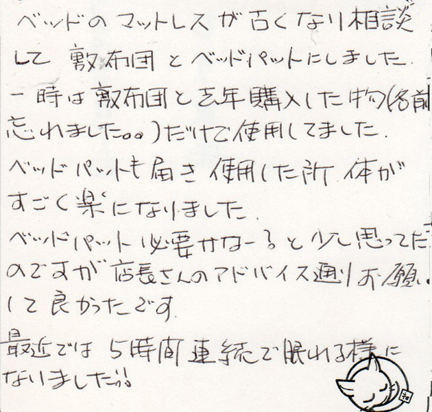 ベットのマットレスが古くなり相談して、敷布団とベットパットにしました。一時は、敷布団と去年購入した物(名前は忘れました)だけで使用してました。ベットパットも届き使用した所、体がすごく楽になりました。