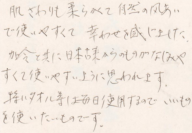 肌ざわりも柔らかく自然の風あいで使いやすくて、幸せを感じました。加齢と共に日本古来からのものがなじみやすくて使いやすいように思われます。特にタオル等は、毎日使用するので、いいものを使いたいものです。 ( 50代女性 富山県富山市 教職 )