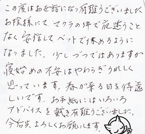 この度は、お世話になりありがとうございました。お蔭様にてマクラの件で夜迷うことなく安心してベットで休めるようになりました。少しづつではありますが、寝始めの不安はやわらぎうれしく思っています。春が来る日を待遠しいです。お手紙にはいろいろアドバイスを戴きありがとうございました。今後共、よろしくお願いします。 ( 50代女性 富山県富山市 主婦 )