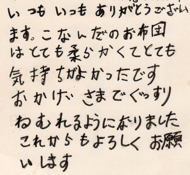 いつも、いつも、ありがとうございます。こないだのお布団はとても柔らかくてとても気持ちがよかったです。おかげさまで、ぐっすりねむれるようになりました。これからも、よろしくお願いします。 ( 20代男性 富山県富山市 自営業 )