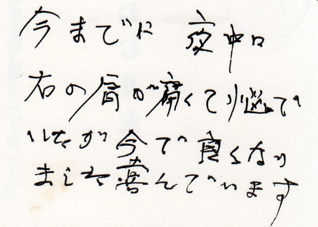 今までに、夜中に右の肩が痛くて悩んでいましたが今で良くなりました。喜んでいます。 ( 60代男性 石川県小松市 会社員 )