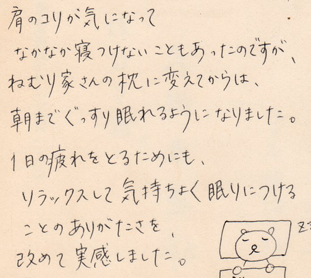 肩のコリが気になって、なかなか寝付けないこともあったのですが、ねむり家さんの枕に変えてからは、朝までぐっすり眠れるようになりました。1日の疲れをとるためにも、リラックスして気持ちよく眠りにつけることのありがたさを、改めて実感しました。 ( 20代女性 富山県富山市 事務職 )