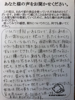 天然のそばがらの良さ、痺れからの解放など、毎日お使いになる中で効果をご実感いただき、それらをお聞かせ下さることは、スタッフにとっても何よりの喜びと励みになります。