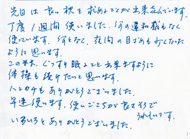 先日は良い枕を求めることが出来、喜んでいます。丁度1週間使いました。何の違和感もなく使っています。何となく夜間の目覚めも少なくなったように思います。このまま、ぐっすり眠ることが出来ますように、寝返り体操も続けたいと思います。いろいろとありがとうございました。