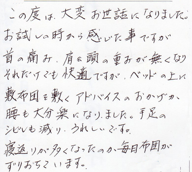 この度は、大変お世話になりました。お試しの時から感じたことですが、首の痛み、肩&頭の重みが無くなり、それだけでも快適ですが、ベッドの上に敷布団を敷くアドバイスのおかげか腰も大分楽になりました。手足のシビレも減り、嬉しいです。寝返りが多くなったのか、毎日布団がずりおちています。