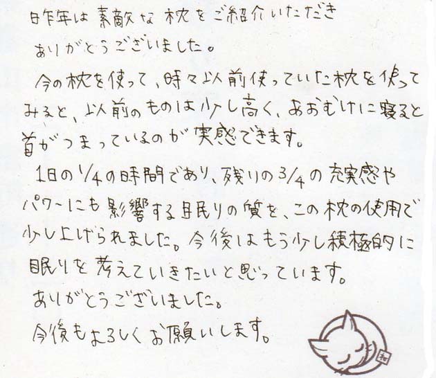昨年は素敵な枕をご紹介いただきありがとうございました。今の枕を使って、時々以前使っていた枕を使ってみると、以前のものは少し高く、仰向けに寝ると首がつまっているのが実感できます。1日の4分の1の時間であり、残りの4分の3の充実感やパワーにも影響する眠りの質を、この枕の使用で少し上げられました。今後はもう少し積極的に眠りを考えていきたいと思っています。今後もよろしくお願いします。