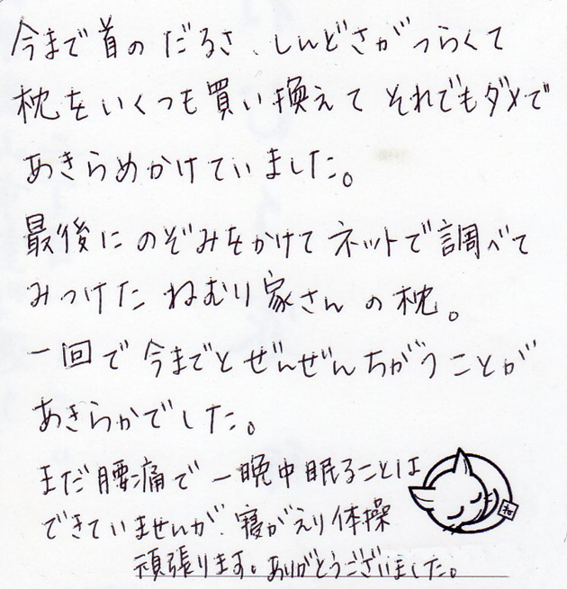 今までの首のだるさ、しんどさが辛くて、枕をいくつも買い換えてそれでもダメで諦めかけていました。最後にのぞみをかけてネットで調べて見つけたねむり家さんの枕。1回で今までとぜんぜん違うことがあきらかでした。まだ腰痛で一晩中眠ることはできていませんが、寝返り体操頑張ります。ありがとうございました。