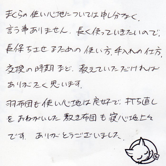 枕の使い心地については申し分なく、言うことありません。長く使っていきたいので、長持ちさせるための使い方、手入れの仕方、交換の時期など教えていただければありがたく思います。羽布団も使い心地は良好で、打ち直しをお願いした敷布団も寝心地上々です。ありがとうございました。