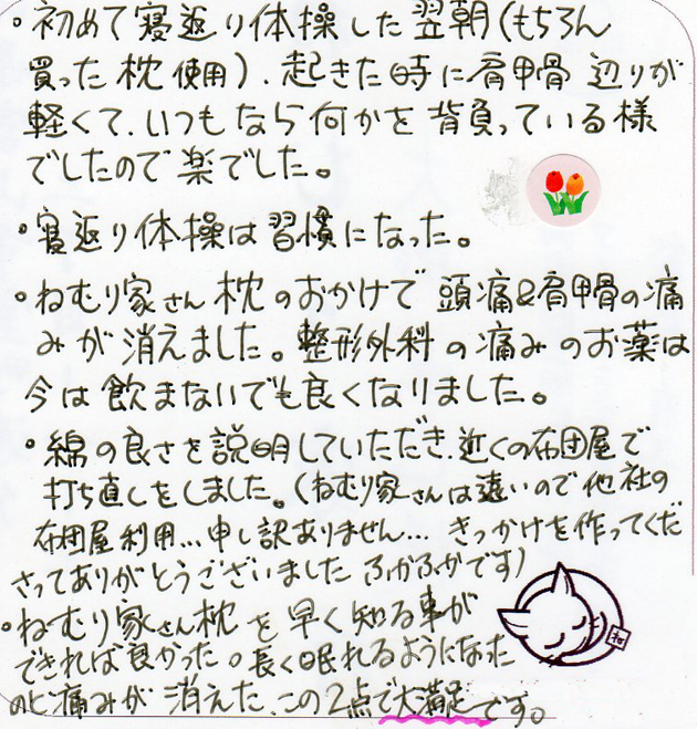 初めて寝返り体操をした翌朝(もちろん買った枕使用)起きたときに肩甲骨辺りが軽くて、いつもなら何かを背負っている様でしたので楽でした。寝返り体操は習慣になった。ねむり家さんの枕のおかげで、頭痛&肩甲骨の痛みが消えました。整形外科の痛みのお薬は今は飲まないでもよくなりました。綿の良さを説明していただき、近くの布団屋で打ち直しをしました。(ねむり家さんは遠いので他社の布団屋利用…申し訳ありません…きっかけを作ってくださってありがとうございました。ふかふかです。)ねむり家さんの枕を早く知ることが出来れば良かった。長く眠れるようになったのと、痛みが消えた。この2点で大満足です。