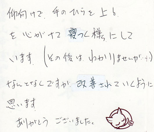 仰向けで、手のひらを上!を心掛けて寝付くようにしています。(その後はわかりませんが)何となくですが改善されていくように思います。ありがとうございました。