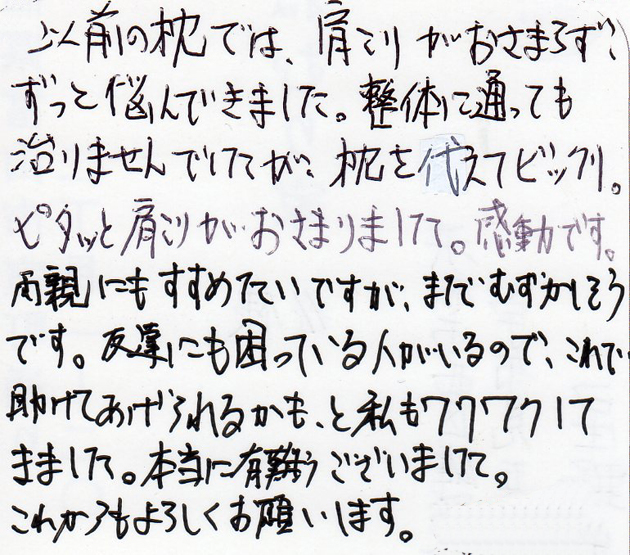 以前の枕では、肩こりがおさまらず、ずっと悩んできました。整体に通っても治りませんでしたが、枕を代えてビックリ。ピタッと肩こりがおさまりました。感動です。両親にもすすめたいですが、まだむずかしそうです。友達にも困っている人がいるので、これで助けてあげれるかも、と私もワクワクしてきました。本当に有難うございました。これからもよろしくお願いします。 ( 30代男性 富山県富山市 会社員 )