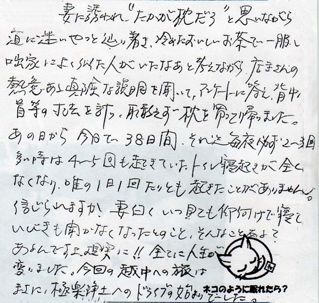 妻に誘われ“たかが枕だろ”と思いながら道に迷い、やっと辿り着き、冷めたおいしいお茶で一服し話家に良く似た人がいたなあと考えながら、店主さんの熱意ある真剣な説明を聞いて、アンケートに答え、背中と首等の寸法を測り、取りあえず枕を買って帰りました。あの日から今日で38日間、それ迄毎夜必ず2〜3回多いときは4〜5回も起きていたトイレ寝起きが全くなくなり、唯の1日1回たりとも起きたことがありません。信じられますか。妻曰く、いつ見ても仰向けで寝て、いびきも聞かなくなったとのこと。そんなことある?あるんですよ、現実に!!すべてに人生が変わりました。今回の越中への旅はまさに、極楽浄土へのドライブの始まりでした。