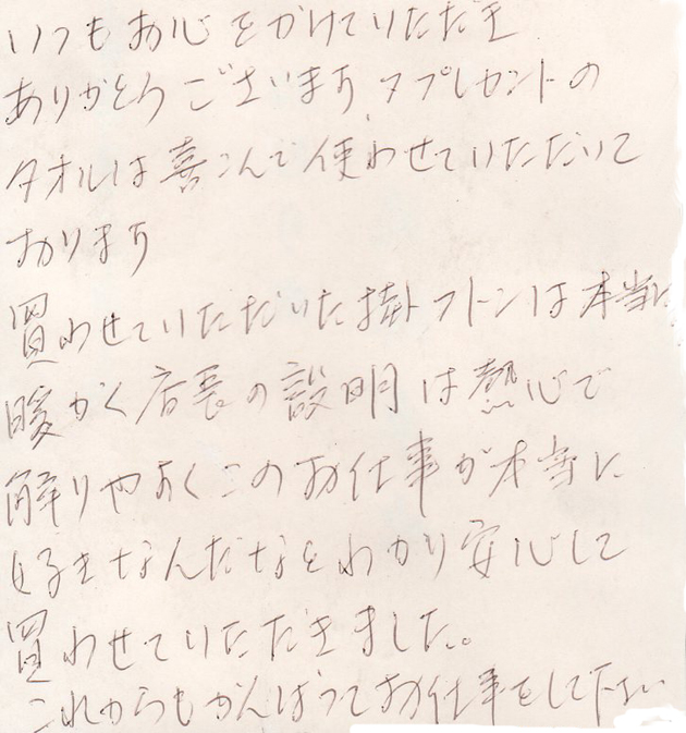 いつもお心かけていただき、ありがとうございます。プレゼントのタオルは喜んで使わせていただいております。買わせていただいた掛フトンは、本当に暖かく店長の説明は、熱心で解りやすくこのお仕事が本当に好きなんだとわかり安心して買わせていただきました。これからも、がんばってお仕事して下さい。 ( 60代女性 富山県富山市 主婦 )